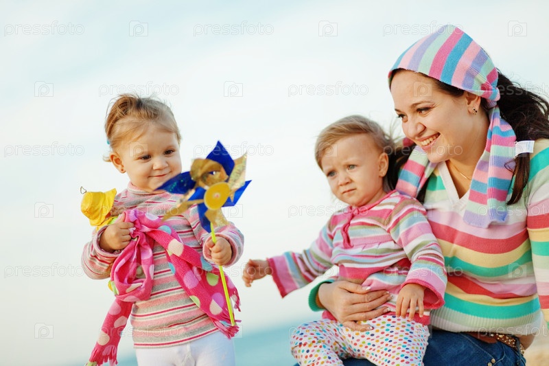 Счастливая семья отдыхает на пляже летом