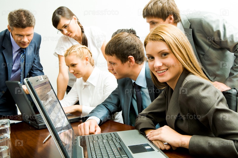 Изображение улыбающейся женщины на фоне компании успешных партнеров, смотрящей на монитор ноутбука