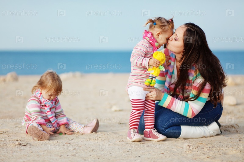 Счастливая семья отдыхает на пляже летом