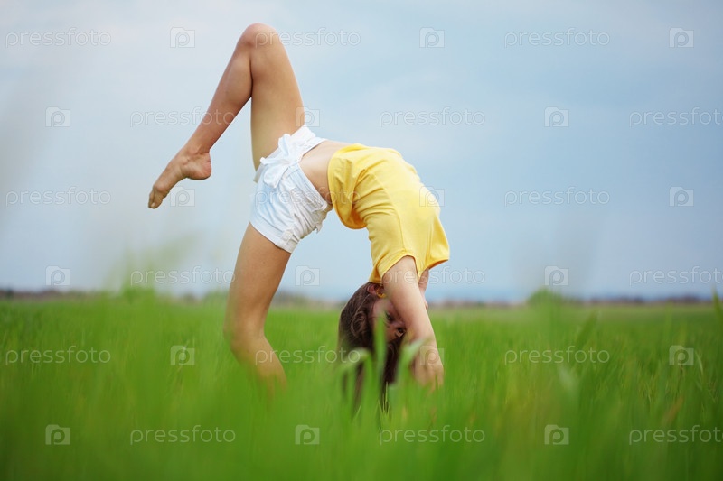 Молодая красивая девушка делает гимнастические упражнения на свежем воздухе