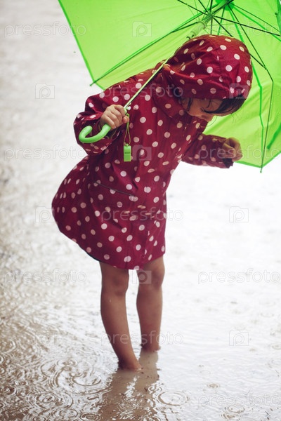 Маленький ребенок гуляет под дождем