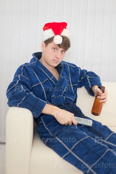 Мужчина в рождественской шляпе сидит на диване в халате, с бутылкой пива и пультом дистанционного управления в руках