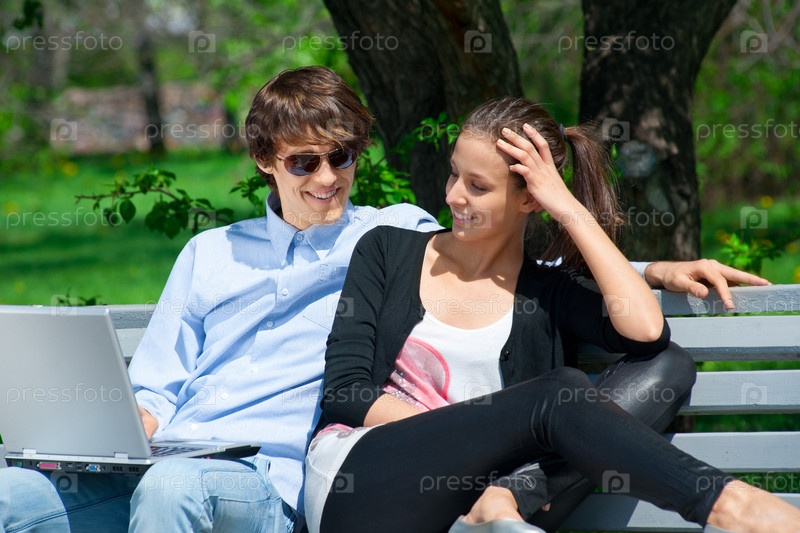 Молодая пара вместе работает на ноутбуке в парке
