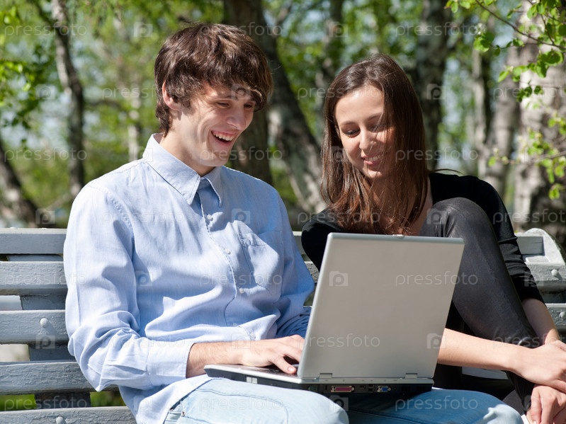 Молодая пара вместе работает на ноутбуке в парке