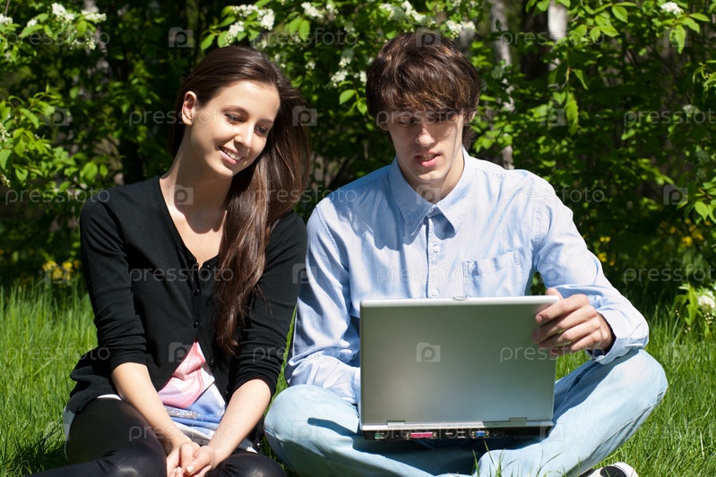 Молодая пара вместе работает на ноутбуке в парке