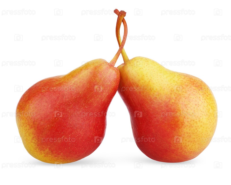 Две спелые красно-желтые груши, изолированные на белом фоне