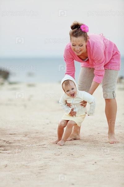 Счастливая семья отдыхает на пляже летом