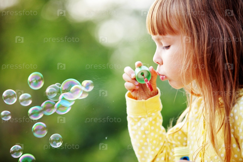 Портрет забавной милой девочки, пускающей мыльные пузыри