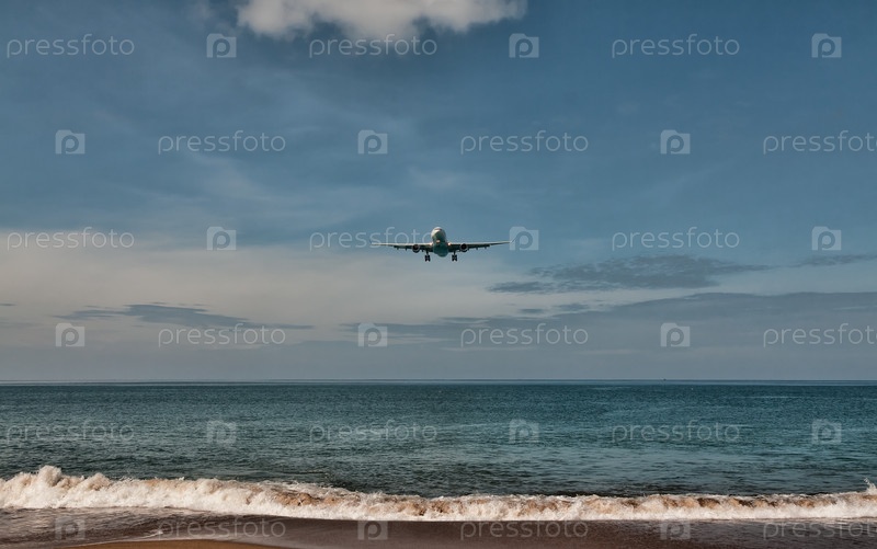 Пассажирский самолет идет на посадку над тропическим пляжем