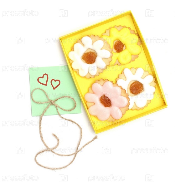 Красочное печенье в бумажной коробке на день Св. Валентина, на белом фоне