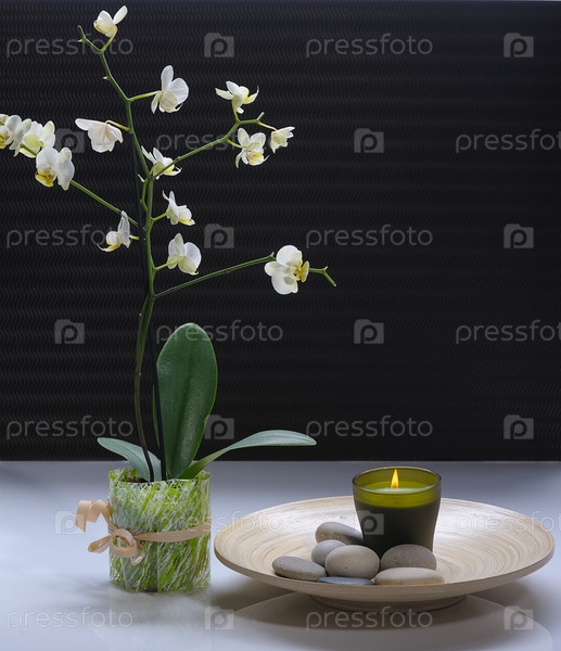 Белая орхидея со свечой и камнями для массажа на блюде