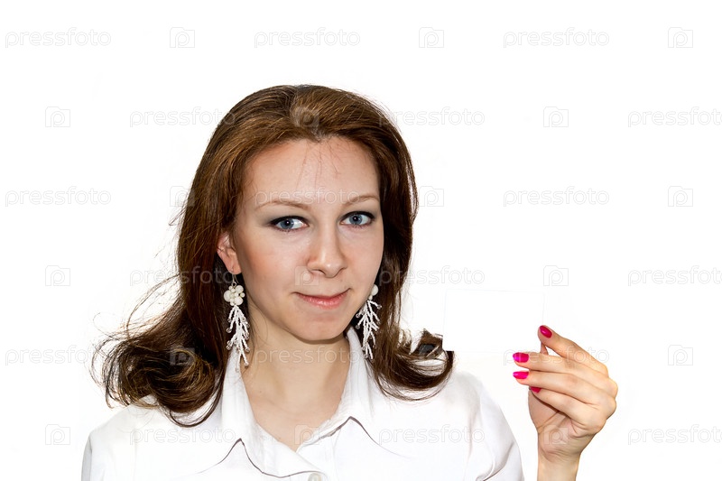 Красивая женщина указывает на пустую визитную карточку, изолированная на белом фоне