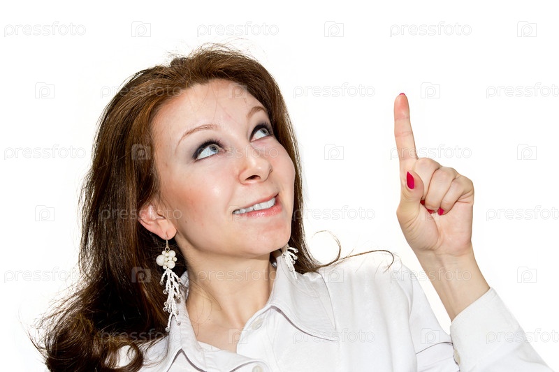 Красивая женщина указывает вниз, изолированная на белом фоне