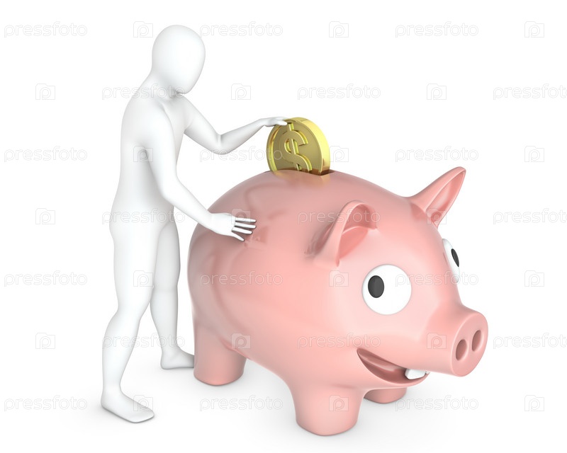 Белая фигура человека, кладущего монету в копилку, изолированная на белом фоне