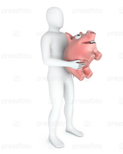 Белая фигура человека несет копилку, изолированная на белом фоне