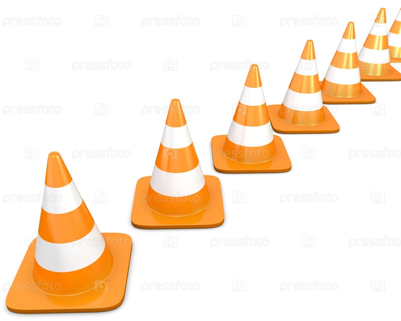 Диагональная линия дорожных конусов, изолированная на белом фоне