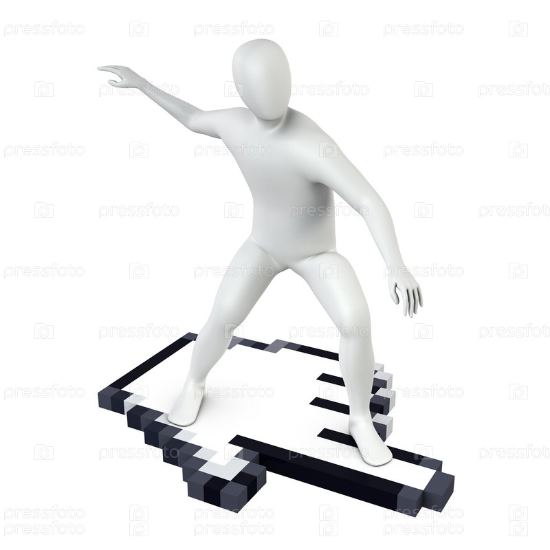 Белая фигура человека едет на компьютерном курсоре, изолированная на белом фоне