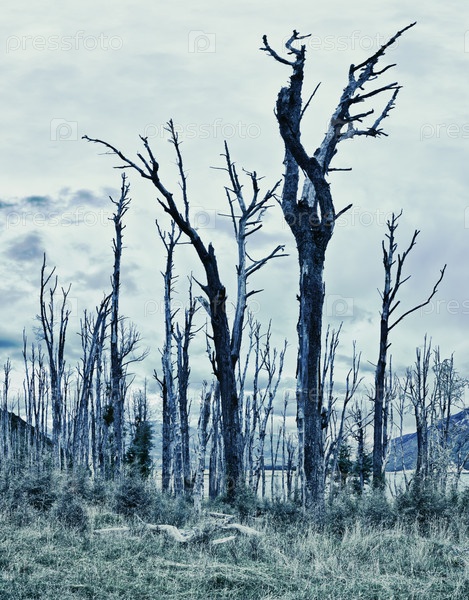 Жуткий лес с сухими деревьями