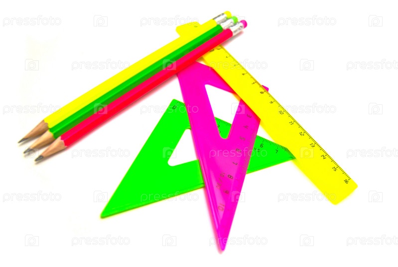 Три карандаша и линейки на белом фоне
