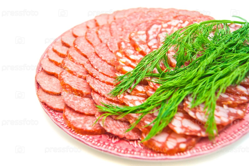 Колбаса с зеленью на тарелке на белом фоне