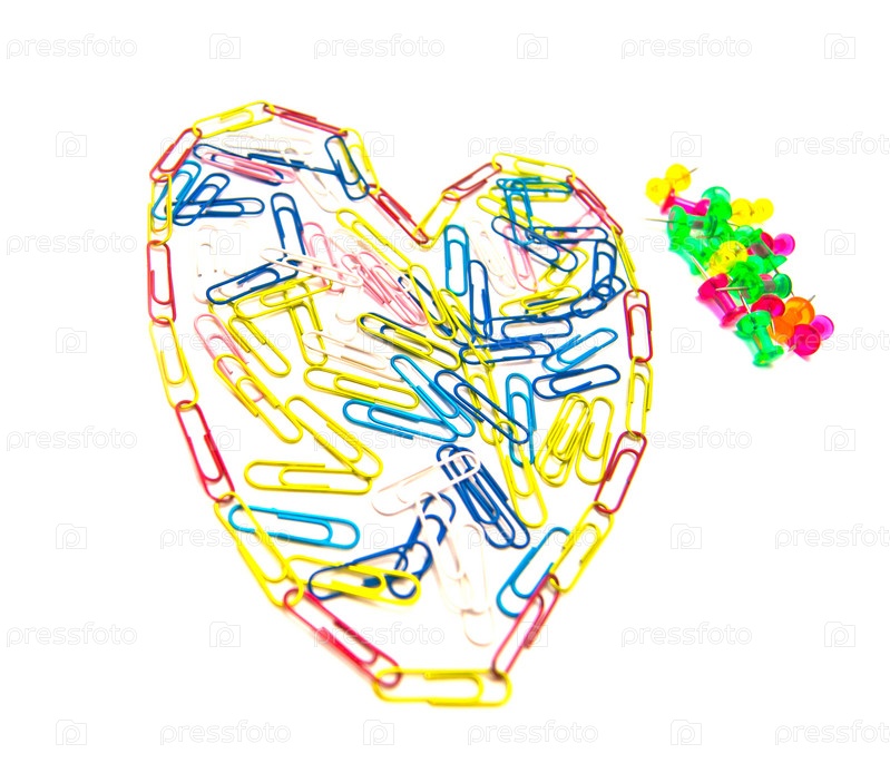 Красочные скрепки и кнопки крупным планом на белом фоне