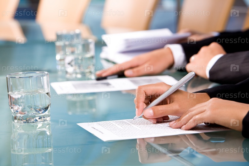 Ряд человеческих рук, держащих перо и делающих заметки со стаканом воды рядом