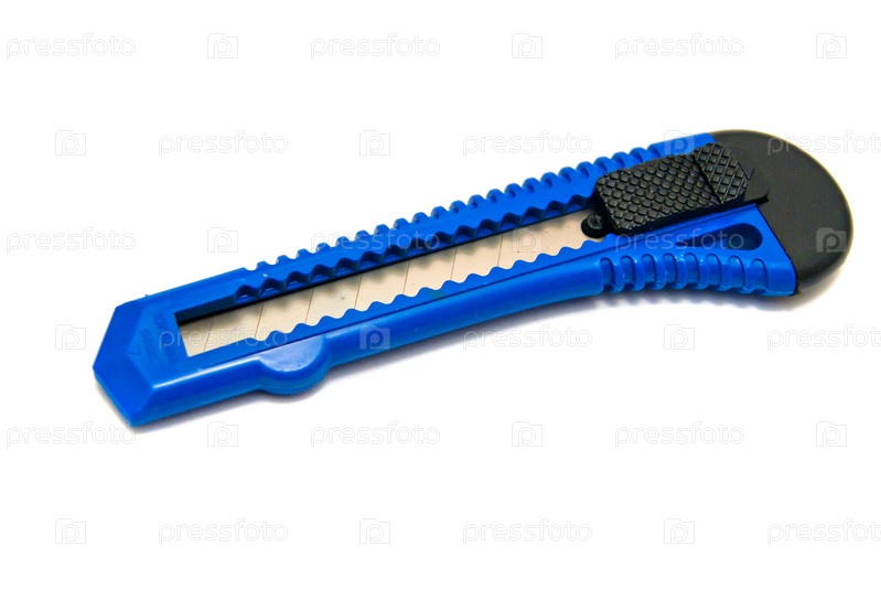 Канцелярский нож крупным планом на белом фоне