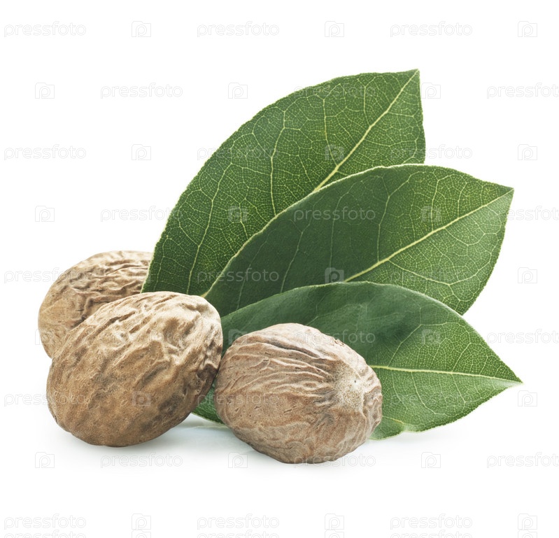 Лавровый лист и мускатный орех, изолированные на белом фоне