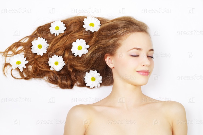 Красивая девушка с белыми хризантемами в волосах на светлом фоне