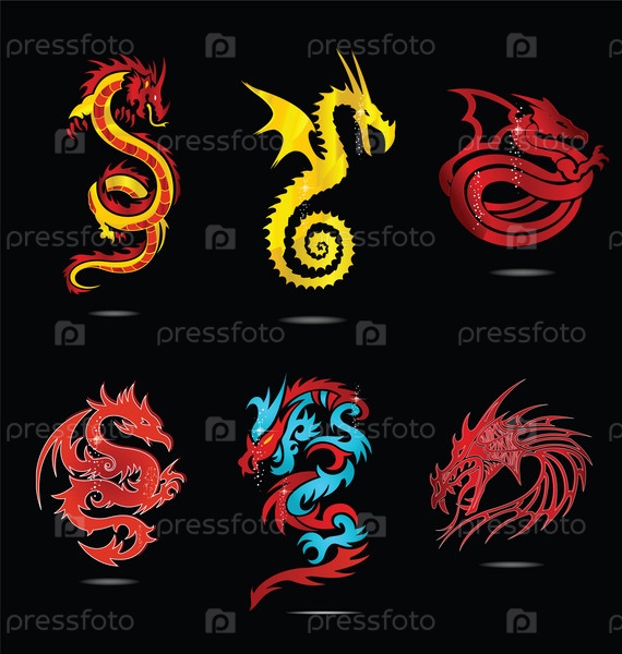 Набор изящных символов драконов, изолированных на черном фоне