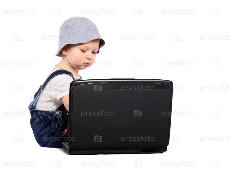 Маленький мальчик сидит с ноутбуком, изолированный на белом фоне