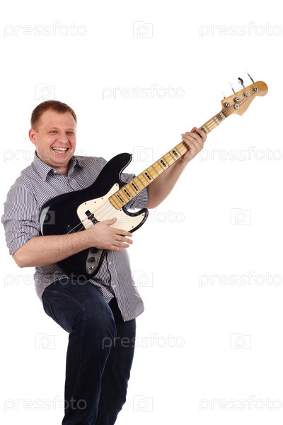 Мужчина играет на гитаре, изолированный на белом фоне