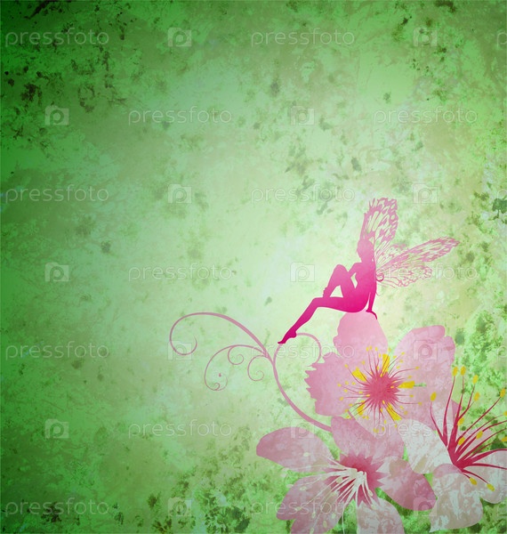 Розовая маленькая цветочная фея на зеленом весеннем или летнем фоне