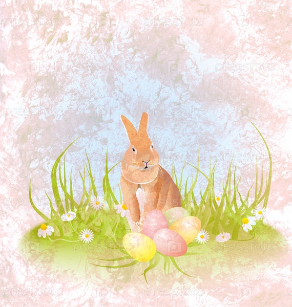 Мультипликационный кролик или заяц сидит в траве с пасхальными яйцами
