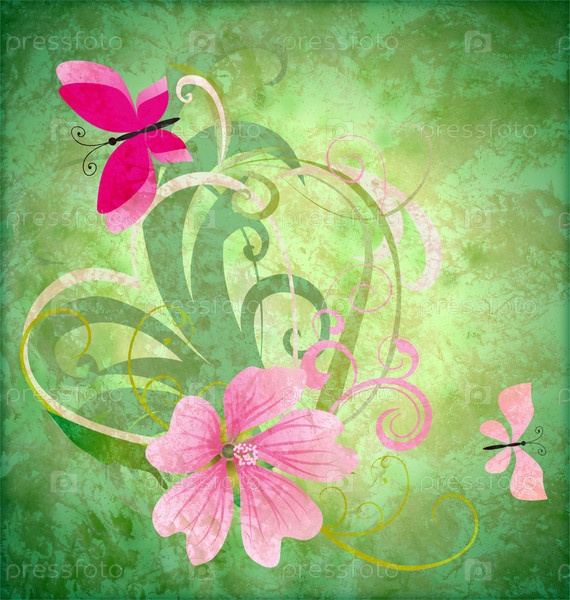 Розовые цветы и бабочка на зеленом фоне. Тема весны или Пасхи