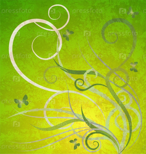 Зеленый гранж фон с бабочками и завитками