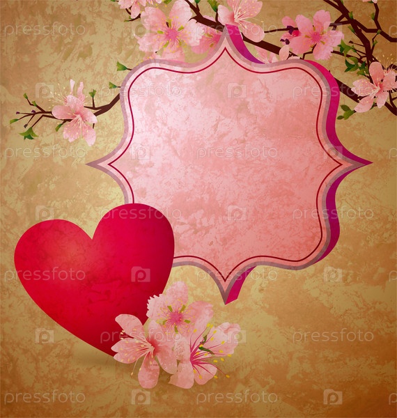 Гранж рамка с цветущей вишневой веткой и красным сердцем ко дню Святого Валентина