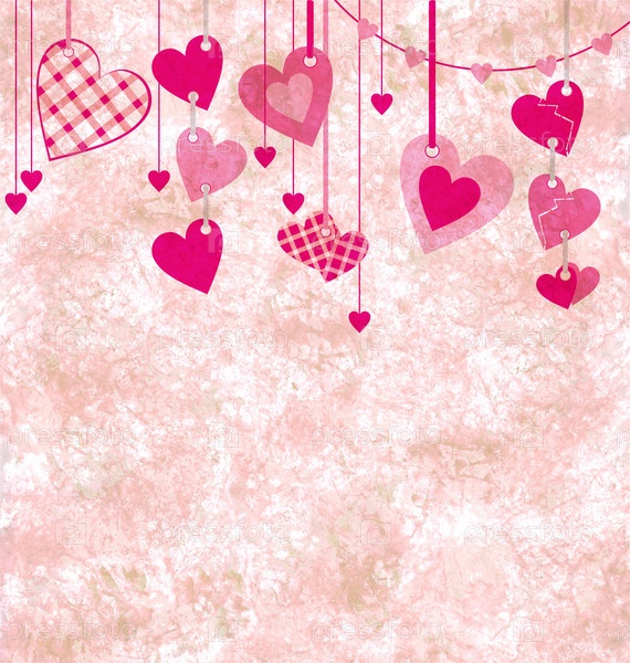 Старинный бумажный розовый фон с висящими сердцами