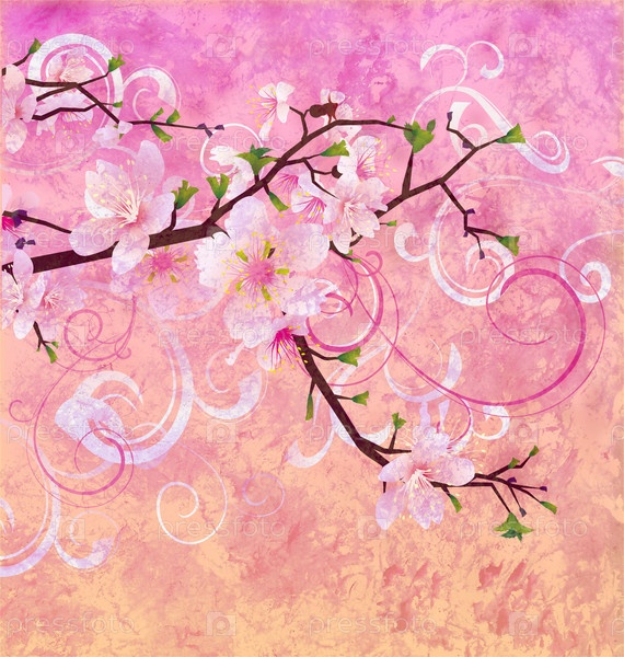 Цветущее персиковое или вишневое дерево на гранжевом фоне