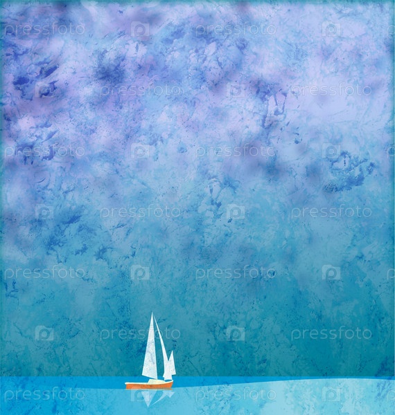 Белая яхта в синем море под голубым небом на гранжевом фоне