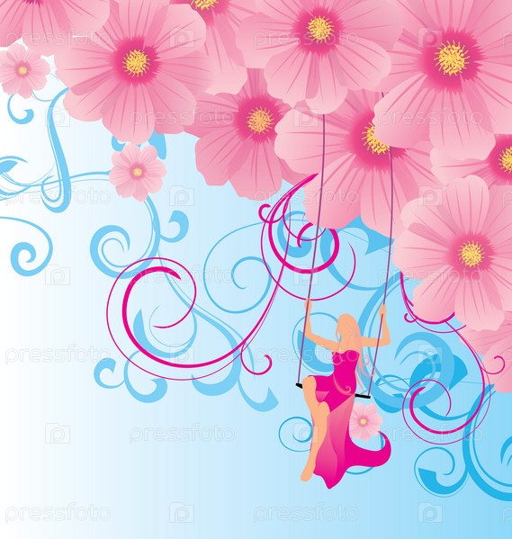 Женщина на качели на голубом фоне с розовыми цветами