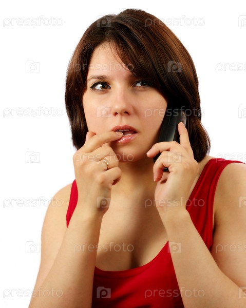 Задумчивая привлекательная брюнетка говорит по мобильному телефону, изолированная на белом фоне