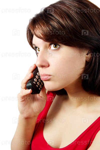 Задумчивая привлекательная брюнетка говорит по мобильному телефону, изолированная на белом фоне