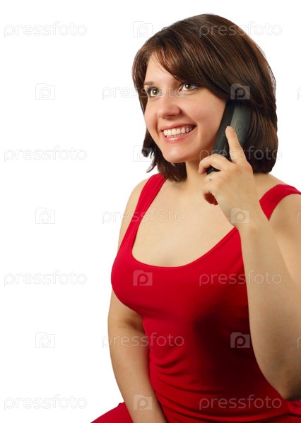 Привлекательная улыбающаяся брюнетка говорит по мобильному телефону, изолированная на белом фоне