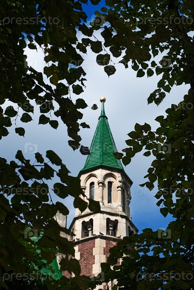 Историческое здание среди ветвей деревьев