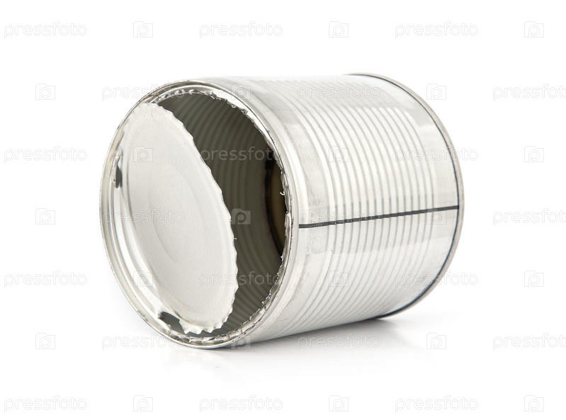 Открытая пищевая жестяная банка, изолированная на белом фоне