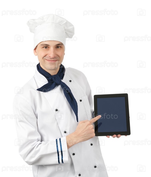 Шеф-повар показывает на цифровой планшет