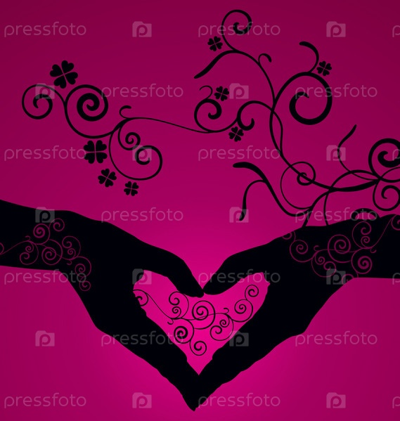 Темные силуэты рук, сложенных в форме сердца, на розовом фоне