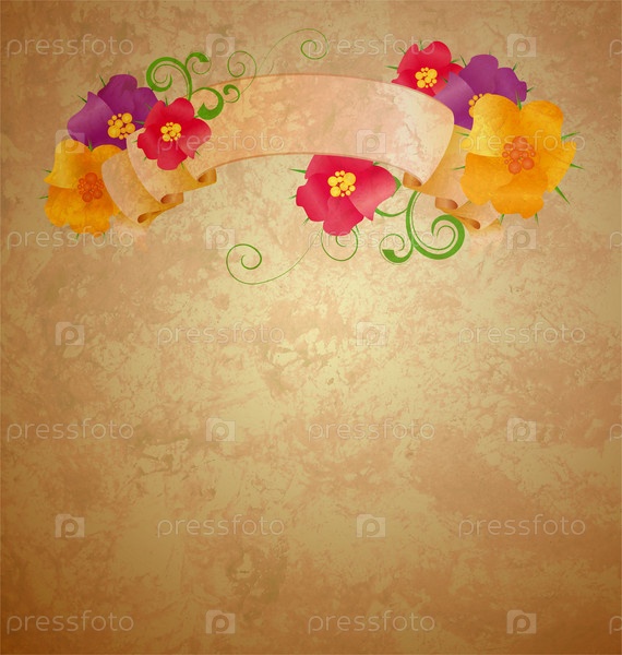 Яркие цветы и лента на гранжевом фоне из старой бумаги