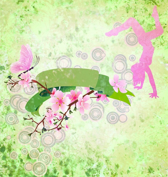 Весенний зеленый фон с танцующей девушкой, веткой сакуры и лентой